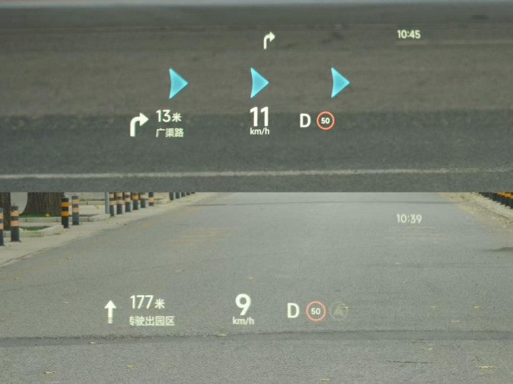 此外,39英寸的AR-HUD配备自适应调节功能,可根据不同用户和不同使用场景自动调节亮度、高度,且提供了标准、AR两种不同显示模式,AR模式可显示动态导航箭头更好的提示左转右转信息,标准模式下可提供导航地图、车速、挡位、辅助驾驶状态等信息。