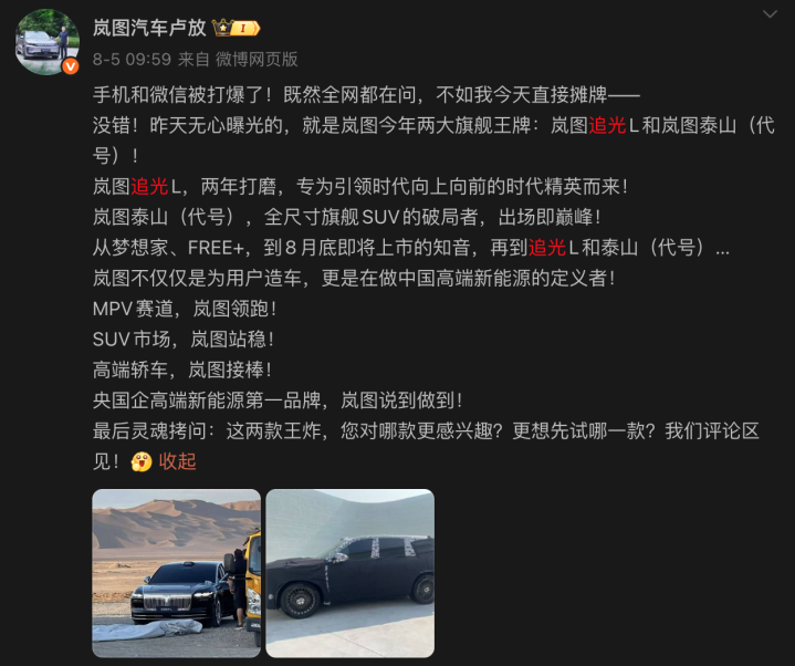今年8月初,岚图追光L凭借着一张“劳里劳气”的无伪装“谍照”成功的引起了消费者们的关注。随之,岚图汽车的卢放总,也大方摊牌,称追光L是岚图今年两大旗舰王牌之一。那既然是王牌,追光L会拿出怎样的产品实力来面对当下竞争激烈的汽车消费市场?